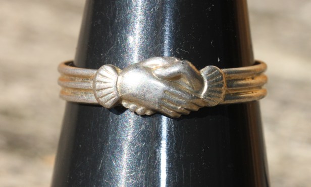 The most common example of clasped hands in jewellery is that of a ring and they are usually associated with romance and friendship. They are called ‘Fede’ rings, for faith, trust, etc, based on the Italian mani in fede (hands in trust). They have two clasped hands and were associated with ‘handfasting’ or engagements leading to marriage, as well as commercial agreements. Between the 17th and 19th centuries in France, a traditional engagement ring was the faith ring (or fede ring). The faith ring has a design of either two holding hands (sometimes holding or hiding a heart), or of two joined hearts, generally set below a crown (Fieggen, http://www.bijouxregionaux.fr/en/). They were usually silver.